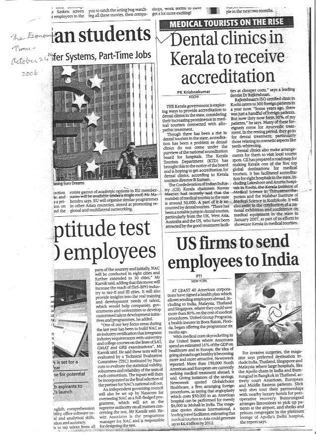 The Kerala government is exploring the ways to provide accreditation to dental clinic in the state, considering the increasing prominence in medical tourism connected with allopathic treatment. From UK, West Asia, Australia and US notable jump in dental tourist to India because of good treatment facilities at cheaper cost says a leading dentist Dr. Rajkrishnan.