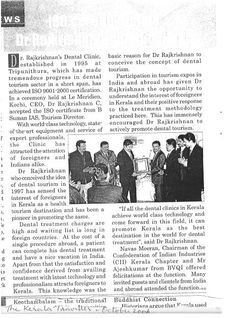Dr. Rajkrishnan’s Dental Clinic, established in 1995 at Tripunithura, which has made tremendous progress in dental tourism sector in a short span, has achieved ISO 9001-2000 certification. In a ceremony held at Le Meridian, Kochi, CEO, Dr. Rajkrishnan.C, accepted the ISO certificate from B Suman IAS, Tourism Director.