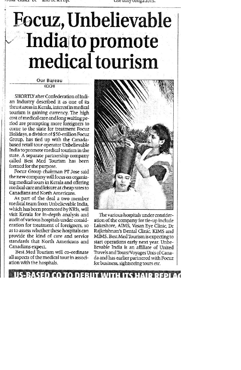 Shortly after confederation of Indian industry described it as one of the thrust areas in Kerala is, interest in medical tourism is gaining currency. The high cost of medical care and long waiting period are prompting more foreigners to come to the state for treatment. Focuz Holidays, a division of $50-million Focuz group, has tied up with Canada based retail tour operator unbelievable India to promote medical tourism in the state. A separate partnership company called Best Med Tourism has been formed for the purpose. Best Med tourism will coordinate all aspects of the medical tour in association with the hospitals. The various hospitals under consideration of the company for tie up Lakeshore, AIMS, Vasan Eye clinic, Dr.Rajkrishnan’s dental clinic, KIMS and MIMS.